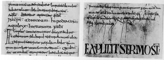 Script is a rapid and expert pre-Caroline minuscule of a distinct type, showing half uncial and some cursive elements (see CLA 5.638); a resembles u; y is v-shaped and dotted. The scribe drops into cursive in the last sentence on fol. 110v. Neumes and probationes pennae on fol. 111v. |