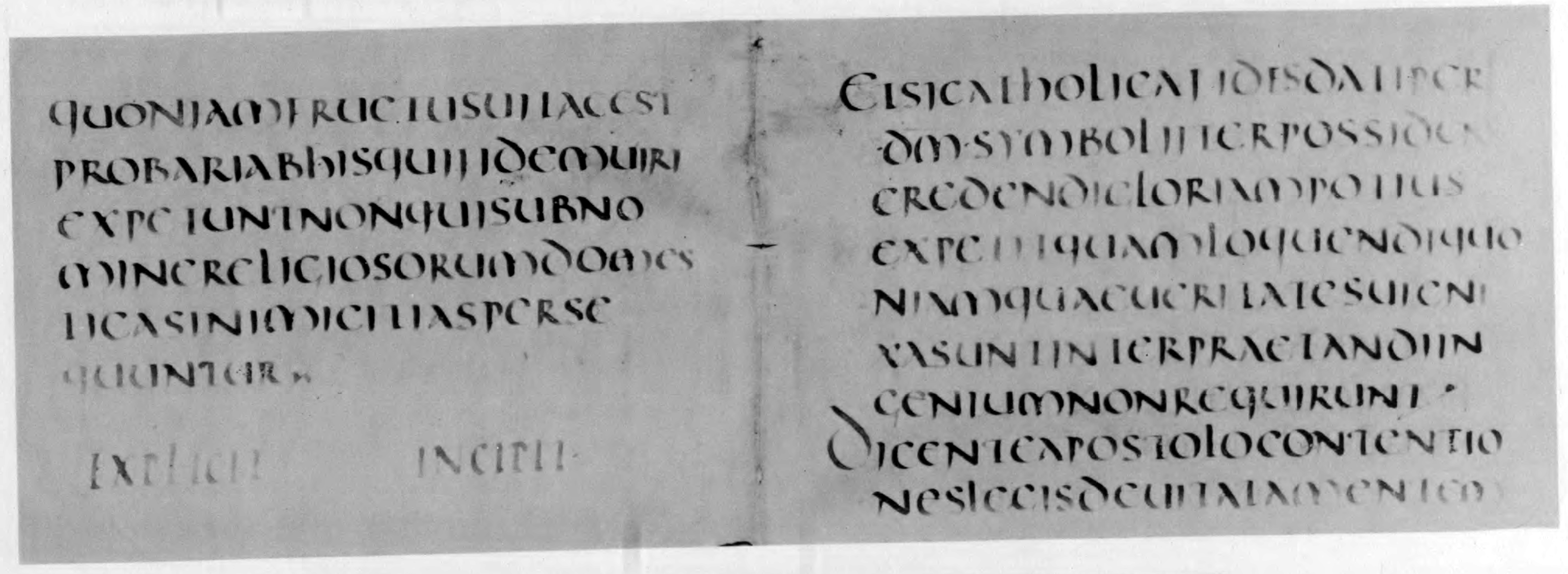 Script is graceful, expert uncial of an old type: the bow of A is pointed; the hasta of E is high; the tail of G is very short; P and q have short descenders. Probationes pennae: biblical excerpts in crude Italian cursive minuscule saec. VIII and the name 'bilihilt' followed by the letters 'a b c d a' in Insular majuscule saec. VIII (fol. A). A puzzling uncial entry 'pro elimosina etone' (saec. VIII) stands in the upper margin of fol. 41. A Nota Tironiana on fol. 74v apparently refers to the name 'Amantia' in the colophon. |