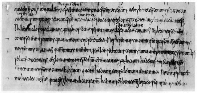 Script is expert Anglo-Saxon minuscule of a compressed type with descenders unusually long: the shoulder of r descends very low and is easily mistaken for the short stroke of another letter; cursive features are seen in the ligature tr and in the looped ascender of d; other ligatures include m, n, tio, and even li in the form of an obtuse angle. |