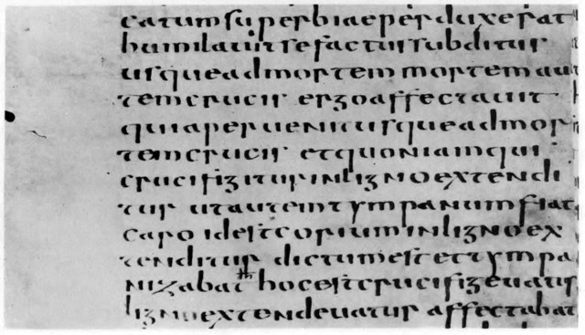 Script is a bold, uniform, though not very expert half-uncial: the form of a is almost uncial; the eye of e is closed; f is long and the hasta is thin and runs along the head-line; the oblique stroke of N is fine and curves somewhat at the bottom; r descends well below the line; the stem of ꞇ is rounded and often unattached to its thin top which mostly bends down at the left; z occasionally goes below the line; uncial G occurs but rarely (foll. 67, 86); e with cedilla occurs. Marginalia, apart from supplied omissions, are by various eighth-century hands: in uncial (fol. 47), in cursive (fol. 36v, 47v), in early minuscule (foll. 25v, 138v); a contemporary corrector added 'emendabi semel deo gratias' under a colophon on fol. 227 and 'do gratias' in the scribe's hand occurs on fol. 191v before the colophon. |